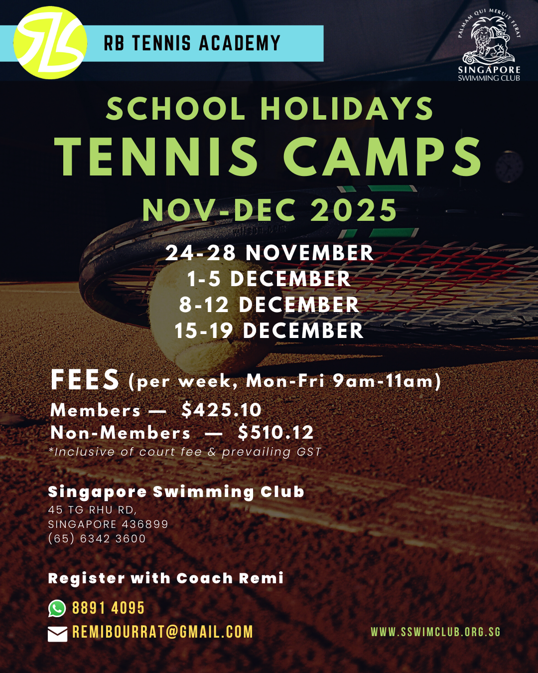 Our weekly (Mon-Fri) tennis camps are scheduled to run during the school holidays in Nov-Dec 2025. Below are the available dates:
